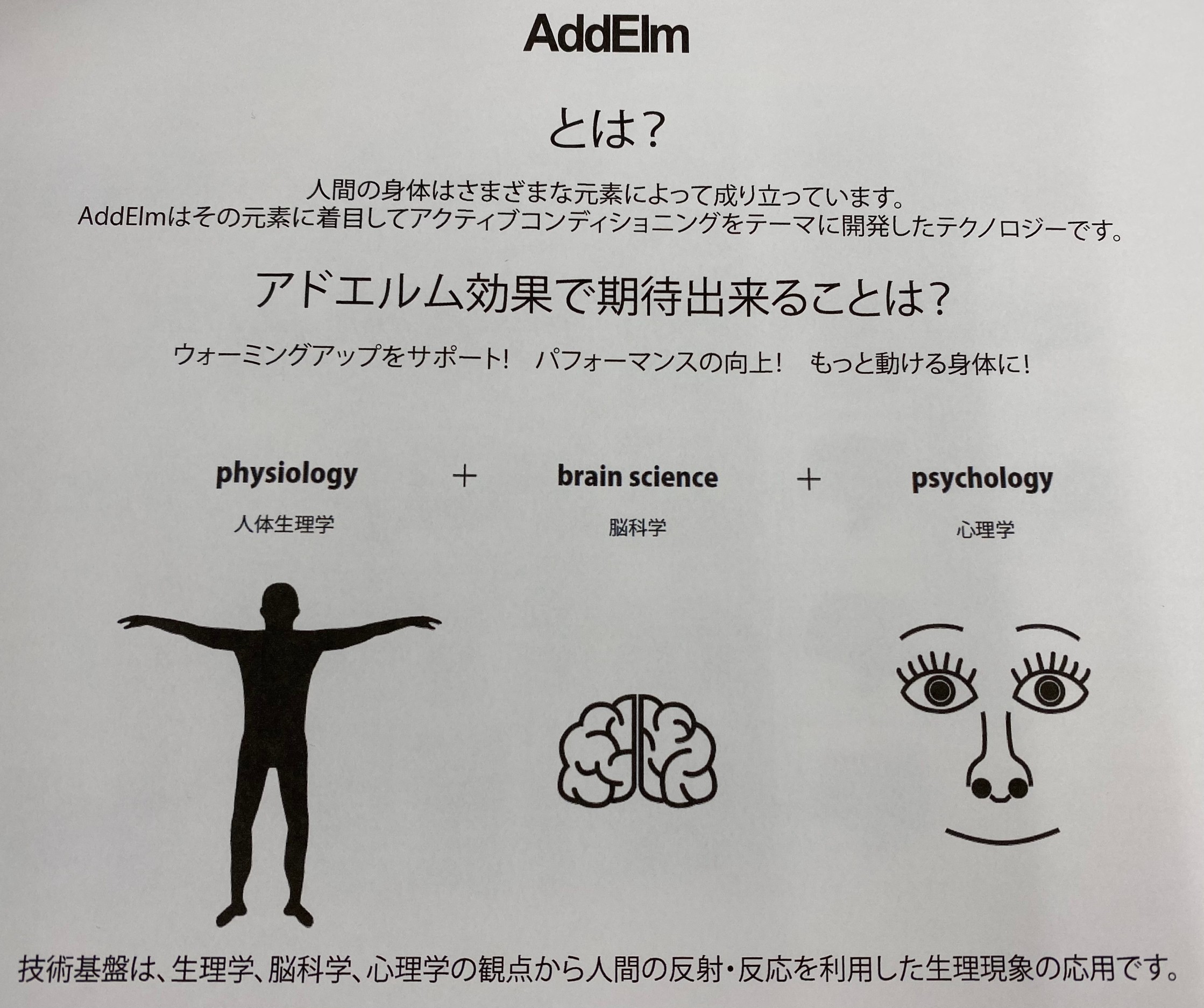 AddElmとは、そもそも人間の身体はさまざまな元素によって成り立っており、その元素に着目してアクティブコンディショニングをテーマに開発したテクノロジーです。