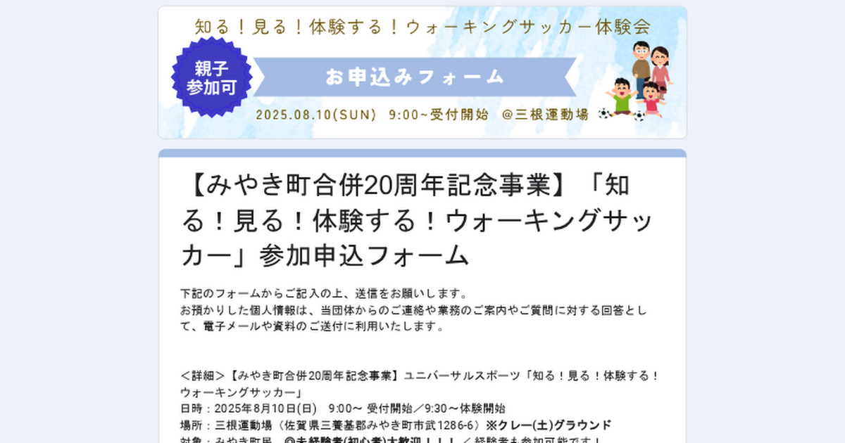 【みやき町合併20周年記念事業】「知る!見る!体験する!ウォーキングサッカー」参加申込フォーム