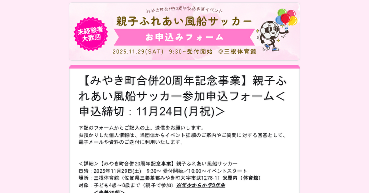 【みやき町合併20周年記念事業】親子ふれあい風船サッカー参加申込フォーム<申込締切:11月24日(月祝)>